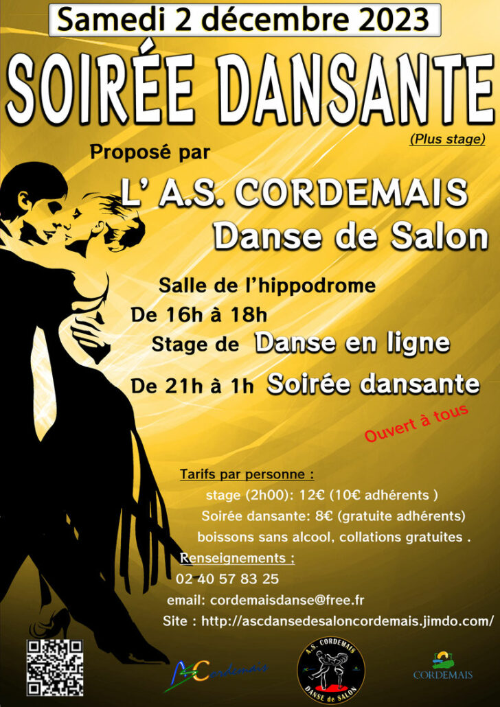 La section danse de salon organise le samedi 2 décembre, un stage de danse en ligne de 16h à 18h suivi d’une soirée dansante de 21h à 1h.